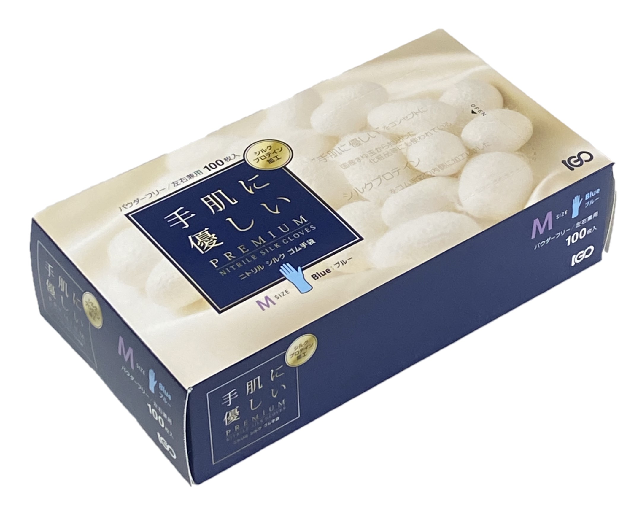 国産まゆ玉から抽出された化粧品にも使われているシルクプロテインをゴム手袋の内側に加工し、手に優しく、より使いやすいゴム手袋を開発しました。 従来にないソフトな仕上りに手にフィットした素肌感覚。 表面は滑りにくいエンボス加工で左右両用です。カラー パウダー 材質 サイズ 入数 ブルー 無 合成ゴム(NBR) SS 100枚 S 100枚 M 100枚 L 100枚 ※ケース入数 (100枚 × 30箱)